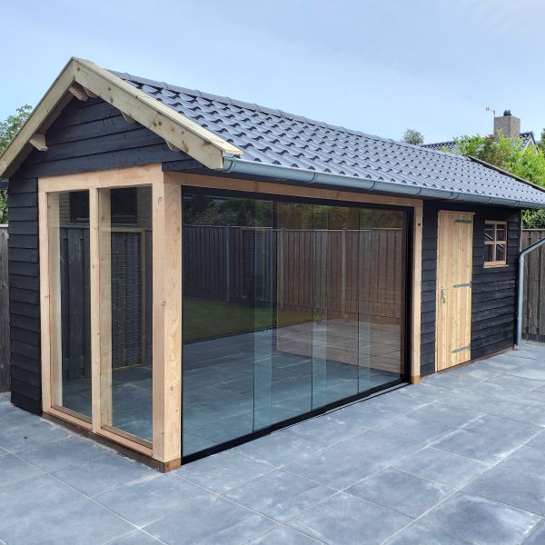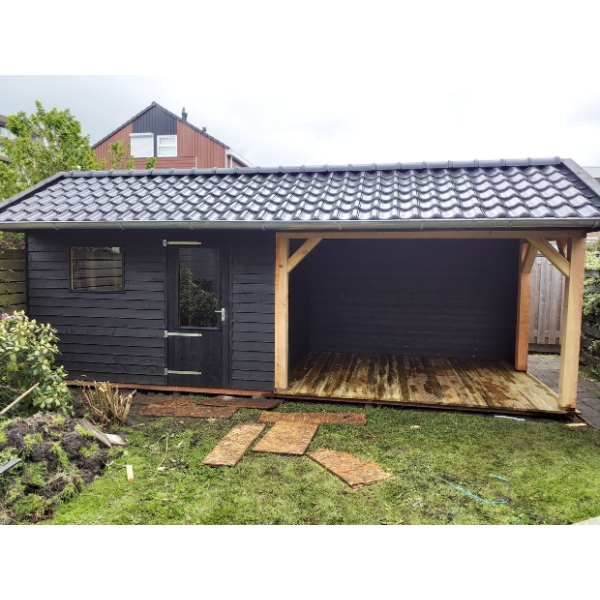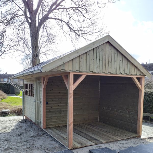 U kunt uw eigen kapschuur overkapping met puntdak – met of zonder combinatie met een opbergschuur – ontwerpen door een keuze te maken uit verschillende mogelijkheden. Zo kunt u de overkapping strak en modern laten uitvoeren, of juist een robuust of traditioneel uiterlijk meegeven door het gebruik van dikkere douglas palen en een gepotdekseld zweeds rabat. Uw tuin, uw overkapping, uw keuzes.